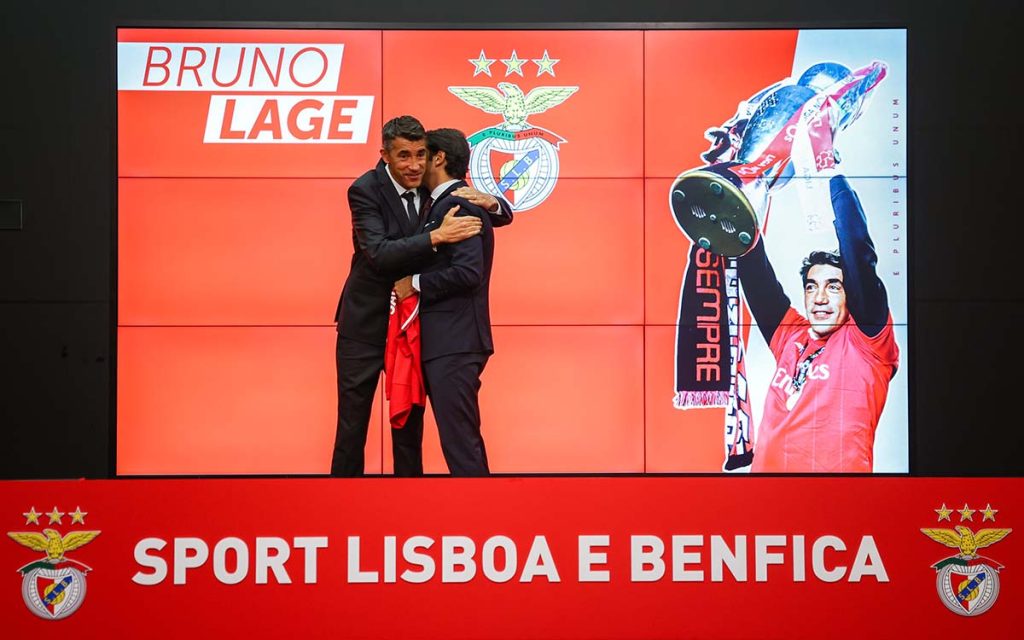 O Benfica, pelo presidente dos encarnados, Rui Costa, apresentou esta quinta-feira, de forma oficial, no Seixal, o novo treinador do futebol profissional do clube, Bruno Lage, ele que vem ocupar o lugar deixado vago depois do despedimento do alemão Roger Schmidt no passado sábado. Recebendo das mãos de Rui Costa a habitual camisola com a referência ao ano do final de contrato agora acordado, 2026, Bruno Lage não escondeu as emoções, nomeadamente quando lhe falaram dos filhos, nomeadamente do pequeno Jaime que, aquando da primeira passagem de Lage pelo comando do futebol dos encarnados, passava os seus dias a ver o canal Panda e que hoje, com 9 anos, “já sabe que o pai voltou para o Benfica”.