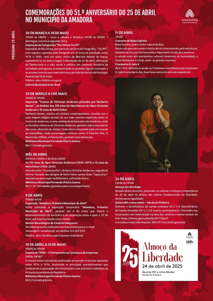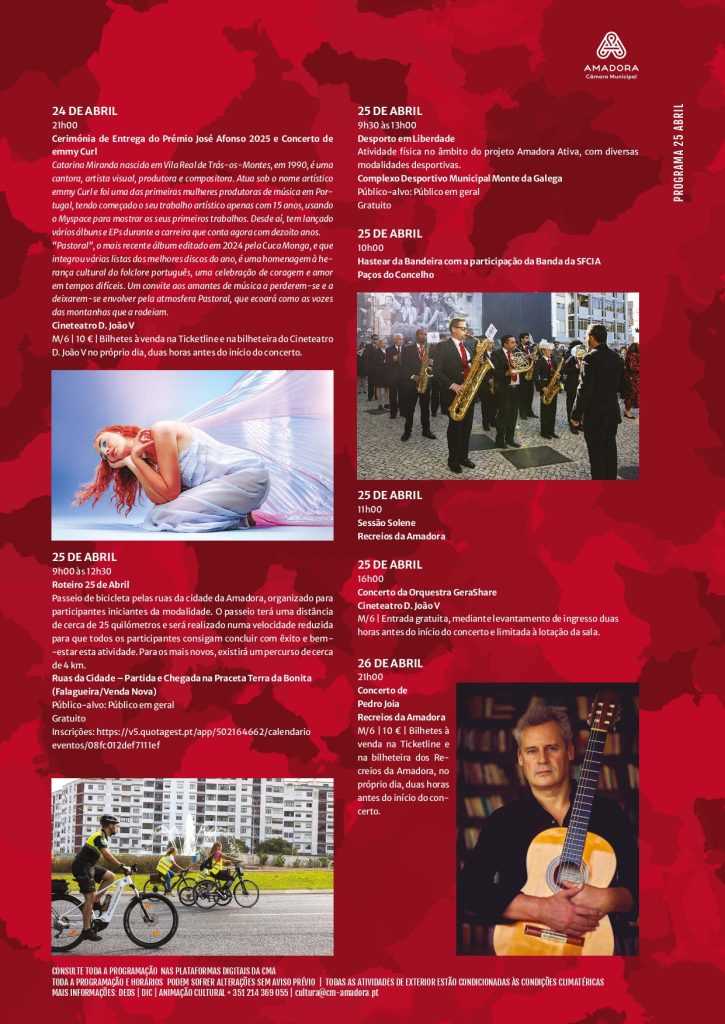 Além do concerto de emmy Curl, na noite de 24 de Abril, em que irá receber o Prémio José Afonso, as comemorações do dia da Liberdade prosseguem às 09h00 do dia 25, sexta-feira, com um passeio de bicicleta pelas ruas da Amadora pela iniciativa Desporto em Liberdade, pelas 09h30, no Complexo Desportivo Municipal Monte da Galega.