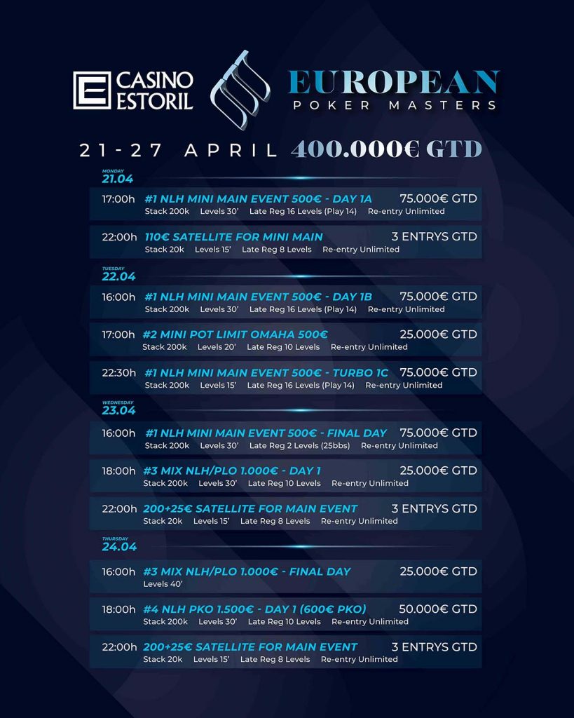 Com um prémio garantido de 400 mil euros e a presença de jogadores de poker de todo o mundo, decorre de 21 a 27 de Abril o European Poker Masters III, evento agendado para o Casino Estoril a permitir a emoção de um torneio de poker de dimensão internacional no qual, durante uma semana, jogadores vindos dos quatro cantos de globo poderão desfrutar de uma experiência inesquecível para todos os participantes de diferentes níveis.