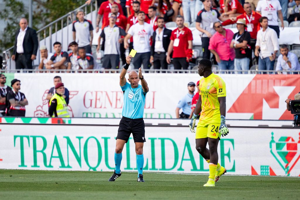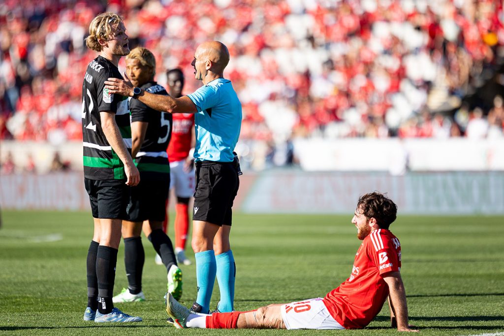O mesmo VAR que antes, ainda no primeiro tempo, aos 12′ minutos, descortinou de forma assertiva e correcta um fora-de-jogo milimétrico ao médio Kokçu, do Benfica, o que impediu a marcação de uma grande penalidade por mão na bola de Gonçalo Inácio que Luís Godinho chegou a assinalar, foi também o mesmo VAR que anulou o que seria um segundo golo do Benfica aos 50′ minutos, por Bruma, alertando o árbitro para uma alegada falta de Carreras sobre Trincão – Luís Godinho seguiu a indicação de Tiago Martins, anulou o golo e deu amarelo ao lateral espanhol dos encarnados –, foi também ele, Tiago Martins, o mesmo VAR que, porventura terá “passado pelas brasas”, isto porque ignorou de forma grosseira a agressão de Matheus Reis a Belotti que daria lugar a um vermelho direto ao jogador leonino à beira do final do tempo de compensação dado por Luís Godinho.