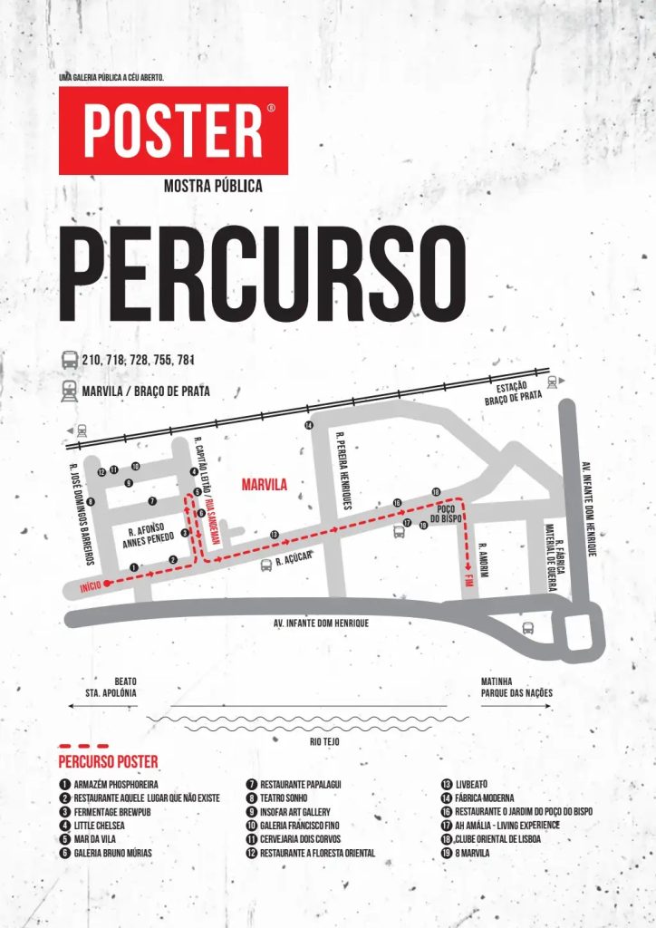 Para a visita guiada, o ponto de encontro é às 16H00, na Rua do Açúcar, junto à Phosphoreira, seguindo depois pela Rua Capitão Leitão (Rua Sandeman), Rua do Açúcar, Largo do Poço do Bispo e Rua Amorim, terminando no 8 Marvila, onde pelas 17h30 será inaugurada a exposição das mais de 200 participações enviadas para a Open Call Poster e Open Call Sandeman.